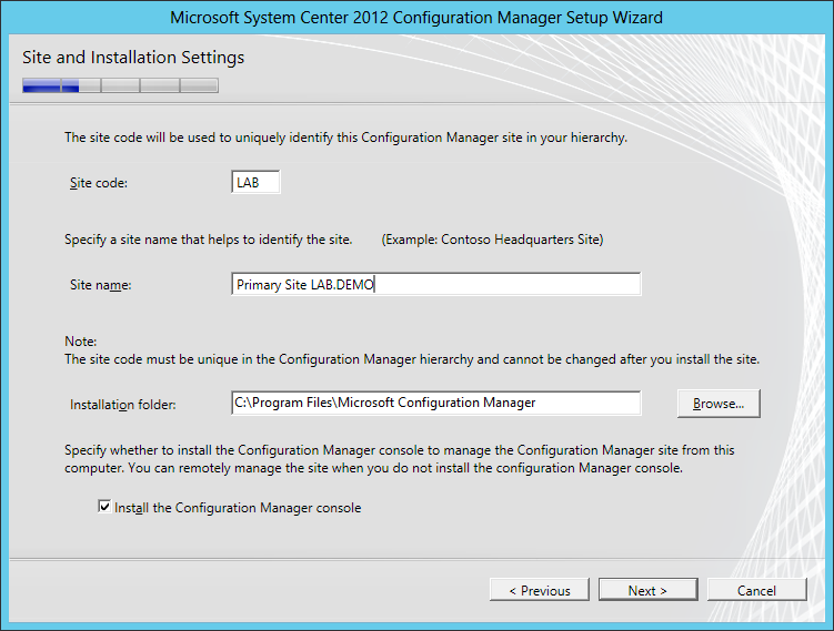 In this post I will share the step-by-step process on how to install System Center 2012 Configuration Manager as a Standalone Primary Server in a Windows Server 2012 lab environment.
