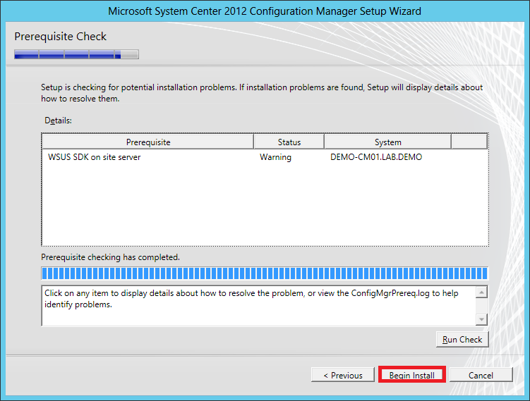 The Installation Prerequisite Check will check your server for problems that will prevent Config Manager installing on your machine and will give you details how to resolve them. Some “Warning” status will also show but this won’t prevent from installing Config Manager.