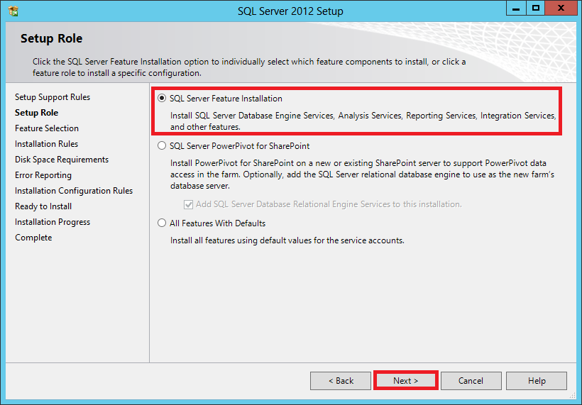 In the Setup Role by default, SQL Server Feature Installation is selected, click Next.