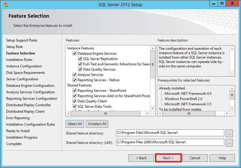 In the Feature Selection, just click the Select All button and click Next.