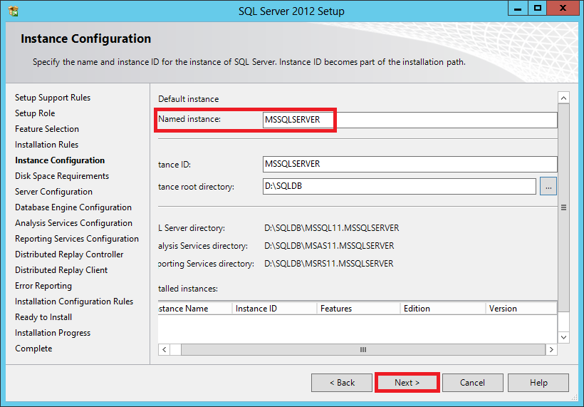 In the Instance Configuration, select Named instance and set it to MSSQLSERVER. You may change the Instance root directory to another location (e.g., D:|SQLDB). Click Next to continue.