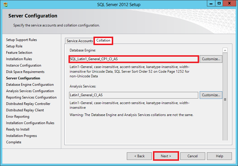 In the Collation tab make sure SQL_Latin1_General_CP1_CI_AS is select are the Database Engine. If SQL Server is installed with a different collation ConfigMgr 2012 installation will fail. Click Next to continue.