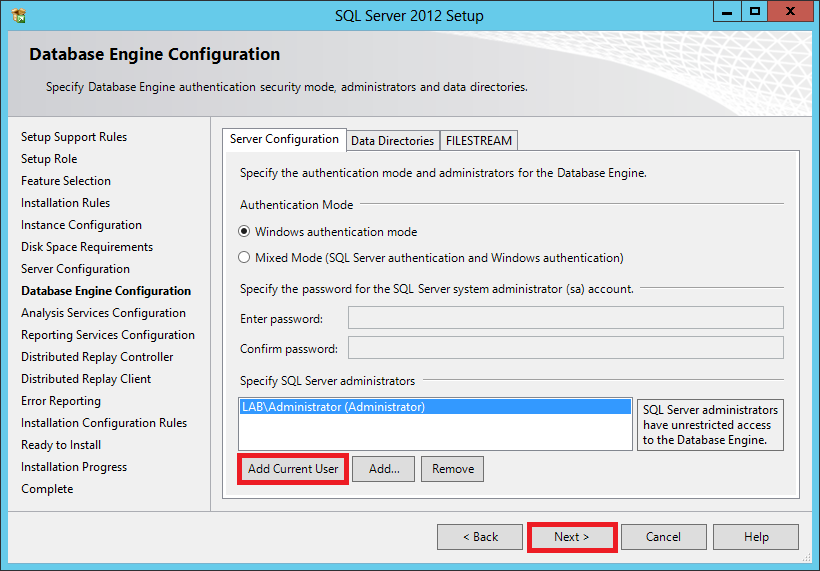 In the Database Engine Configuration, click Add Current User and click Next.