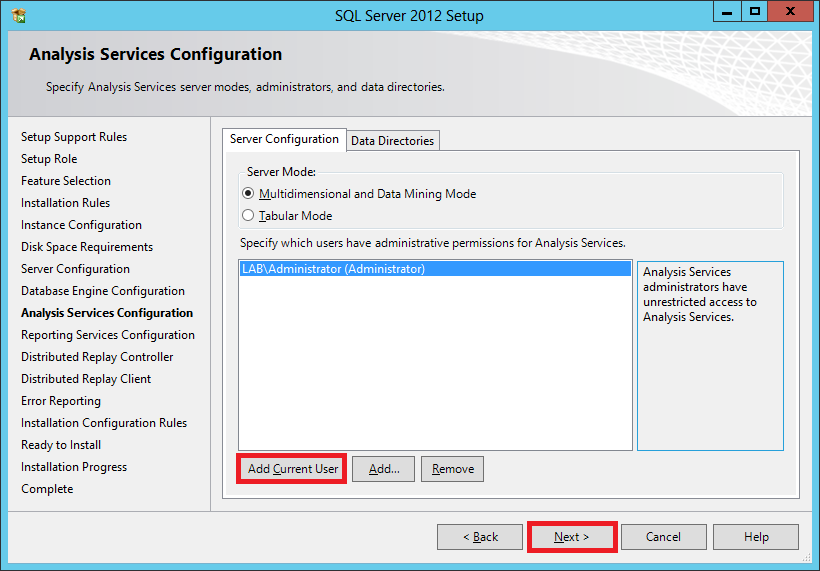 In the Analysis Services Configuration, click Add Current User and click Next.