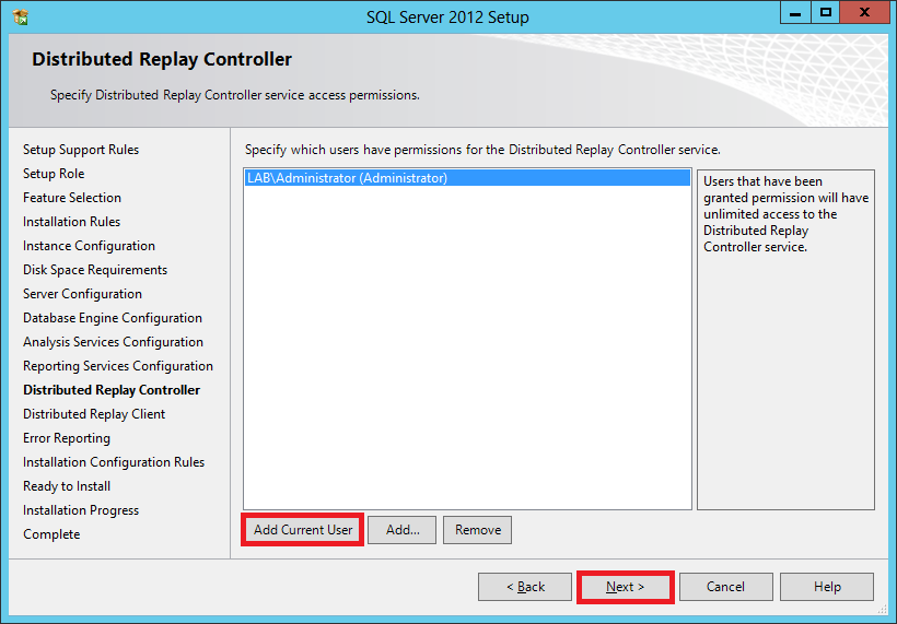 In the Distributed Replay Controller, click Add Current User and click Next.  In the Distributed Replay Controller, Click Next.