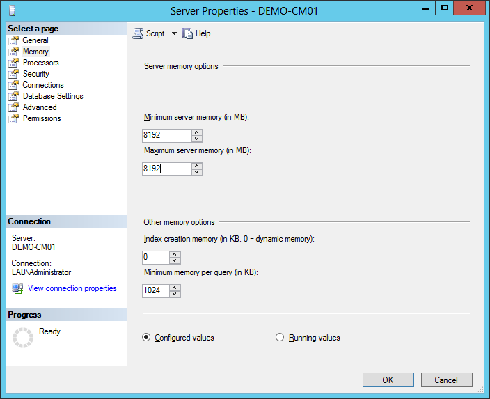 Under the Memory I have set the Minimum and Maximum memory size to 8192 if don’t set this into 8192 you’ll have a little warning during the installation of Config Manager 2012. Setting the Memory b/w 2048 to 4096 will still work. By default the Minimum server memory (in MB) is set to 0 and the Maximum server memory (in MB) is set to 2147483647.