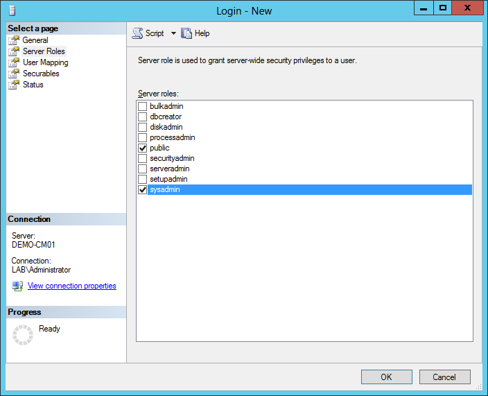 Under Server Roles tick the [ ⁄ ]sysadmin check box to give the SCCMAdmin account SQL privileges, click OK to close the window. Close the SQL Server Management Studio and we’re done with the setup of SQL Server 2012.