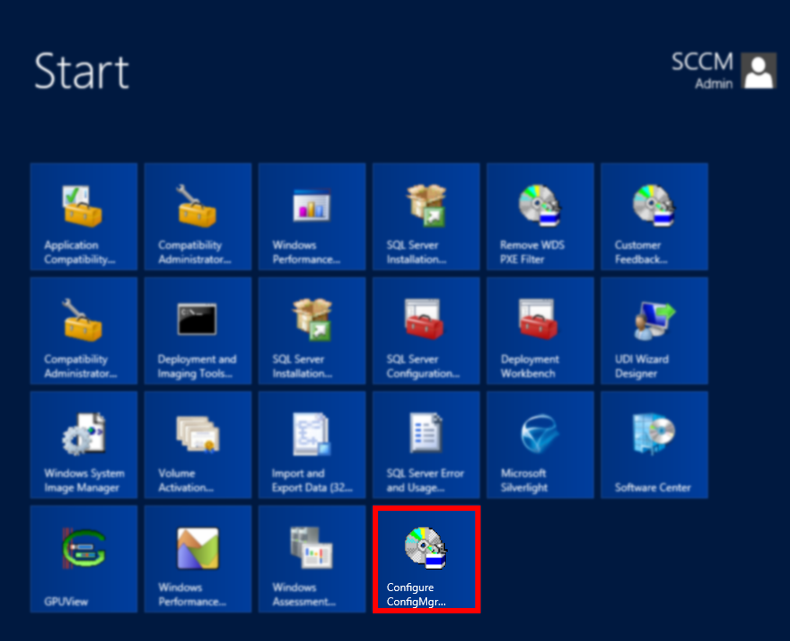 In the Windows Server 2012 Start Menu right-click on Configure ConfigMgr…
