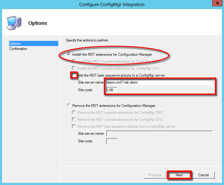 Select Install the MDT extentions for Configuration Manager tick the Add the MDT task sequence actions to a ConfigMgr server box. Input the Site server name and and Site code then click Next.