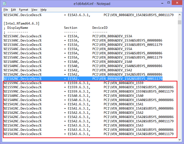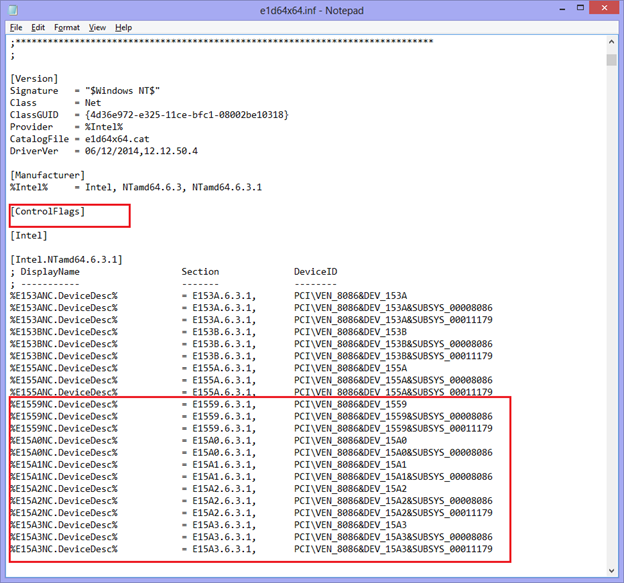 All you need to do is to copy the [Intel.NTamd64.6.3.1] section to notepad.exe and replace all instances of “.6.3.1,” with “,” then copy that section to [Intel.NTamd64.6.3] The advantage is that we use the correct DDInstall Section for server rather than for workstation.
