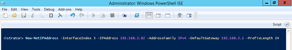 New-NetIPAddress -InterfaceIndex 3 -IPAddress <IP Address> -AddressFamily IPv4 -DefaultGateway <Gateway IP Address> -PrefixLength 24