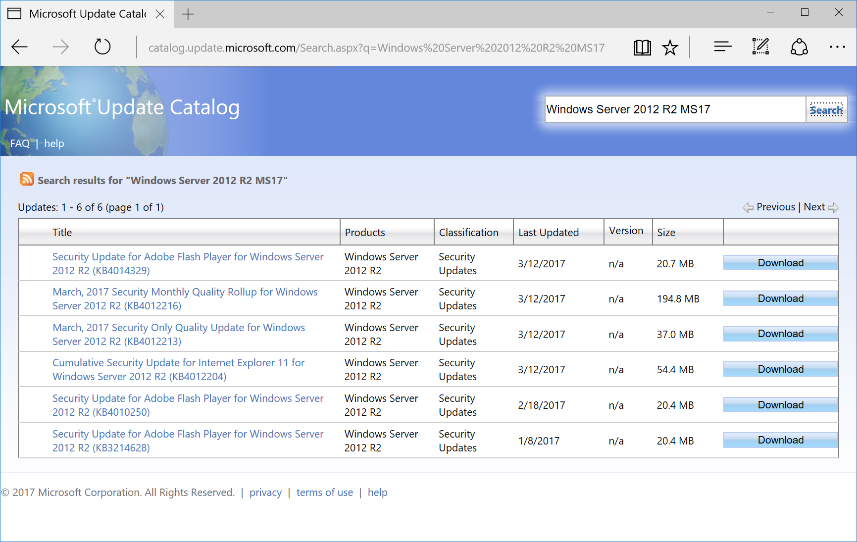 Example: Search for Windows Server 2012 R2 March 2017 Updates.