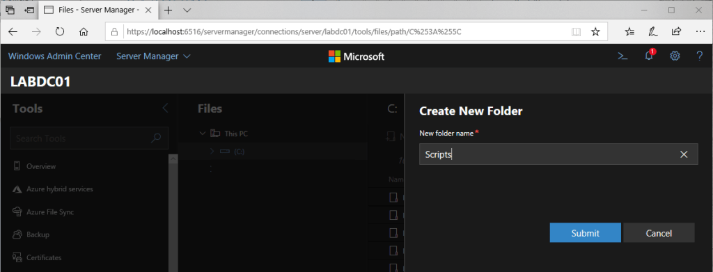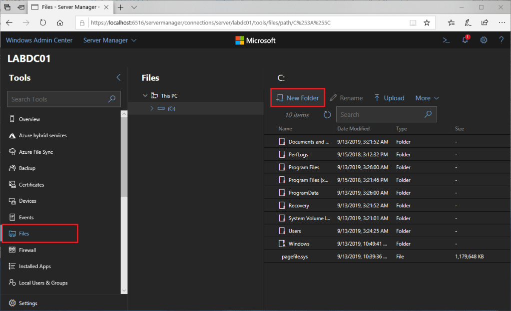 In LABDC01, under the Tools, go to Files and click on the New Folder under C:.