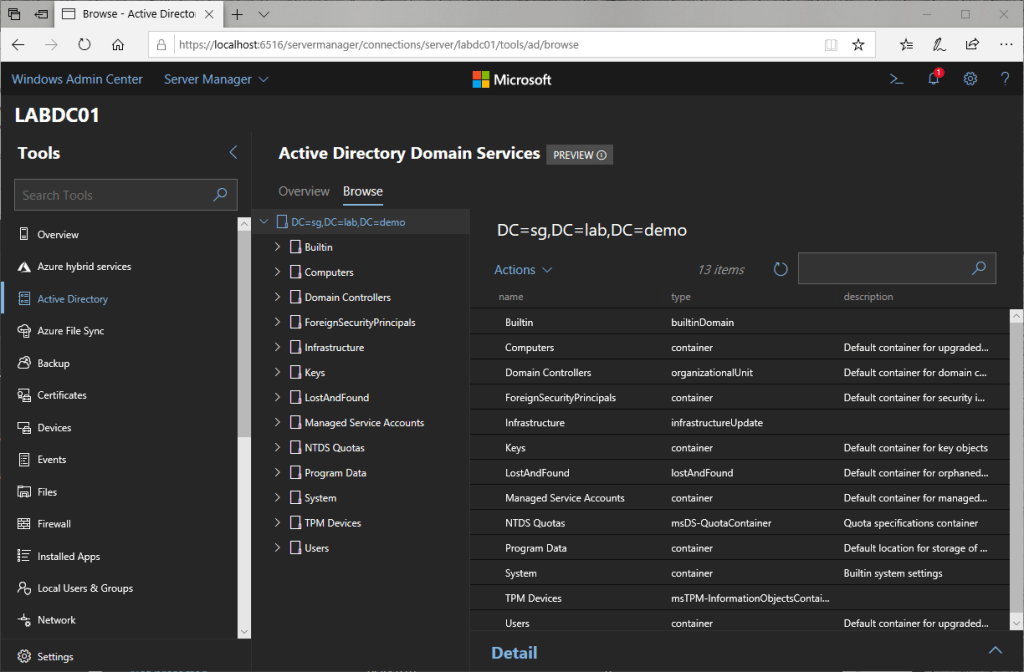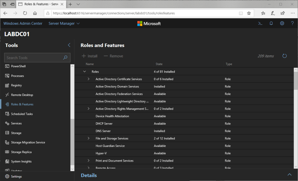 In the Windows Admin Center, inspect the Roles & Features you’ll see that Active Directory Domain Services status is now Installed.