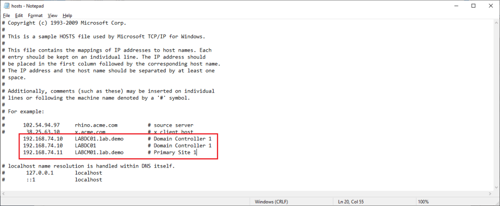 From the screenshot below you can see that I have defined my hostnames even before the promotion of my Domain Controller (LABDC01) and installation of the ConfigMgr Server (LABCM01).