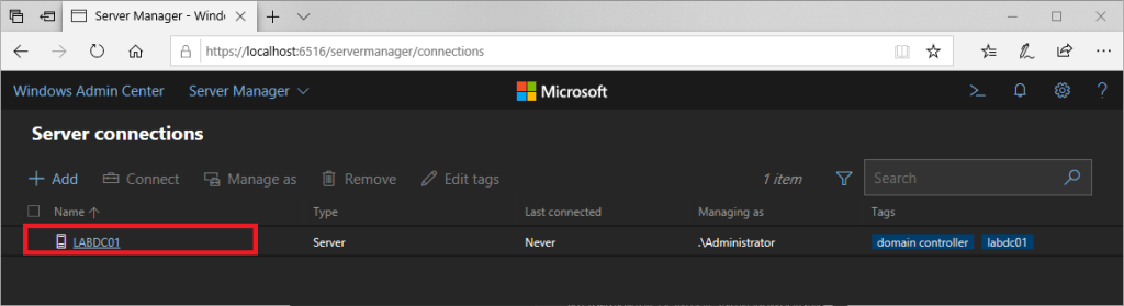 In the Servers > Add one, we’ll type the hostname LABDC01 and enter the LABDC01 Administrator’s credentials. Optionally, you can also add tags for this server. Click Add with credentials