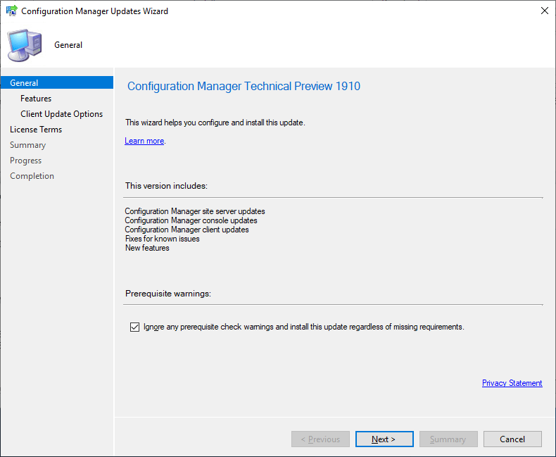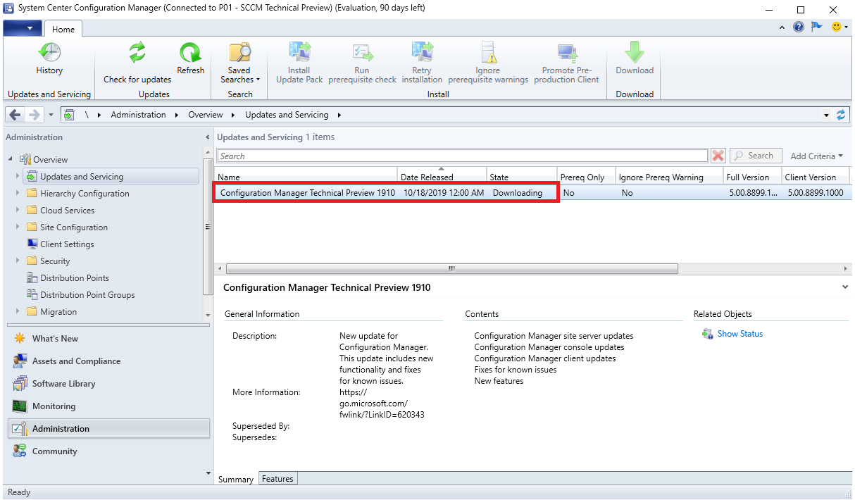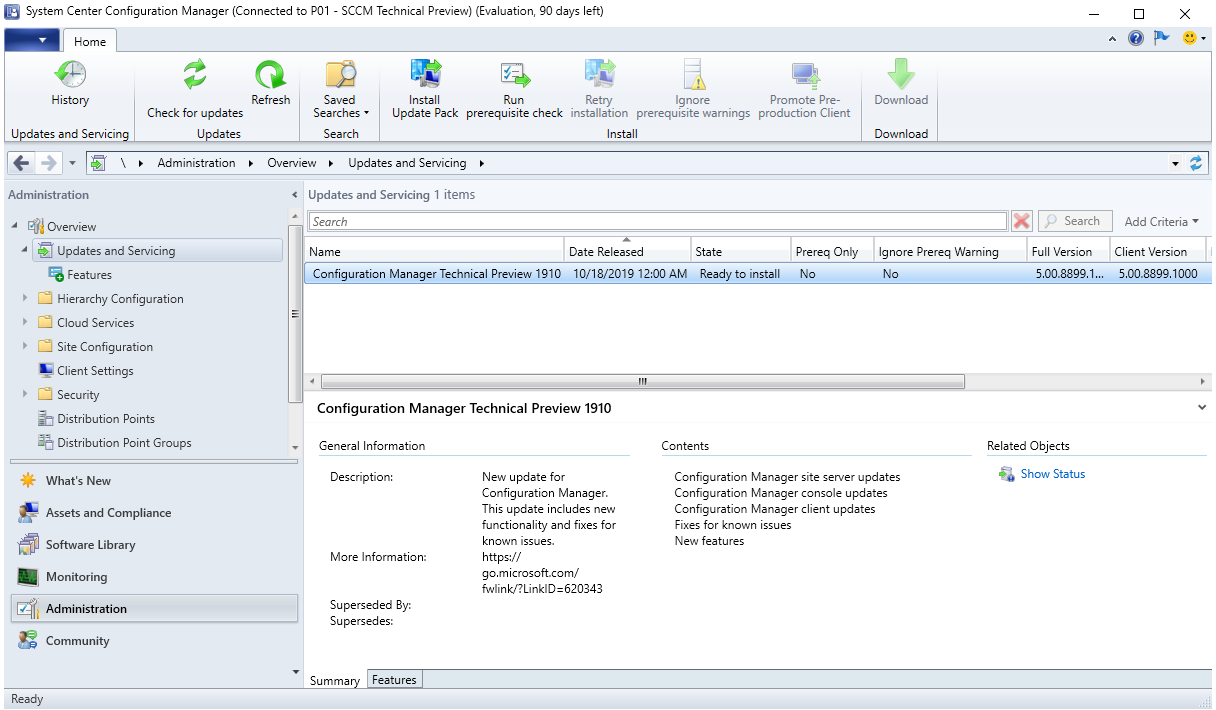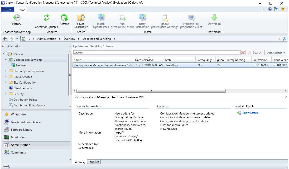 In this case, ConfigMgr 1910 Technical Preview now out! It should appear in the Administration > Updates and Servicing