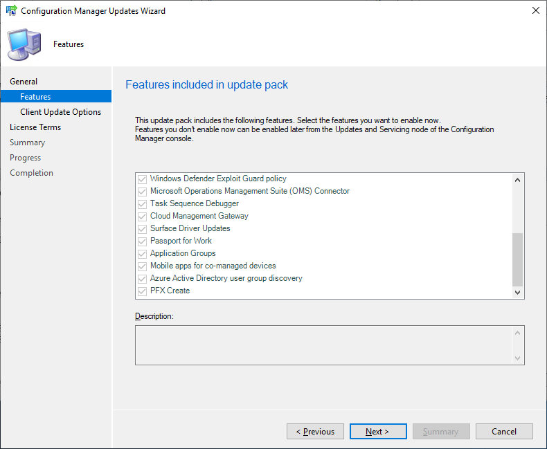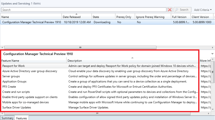 When you click on the Features tab, you’ll see all the features name available for ConfigMgr TP 1910