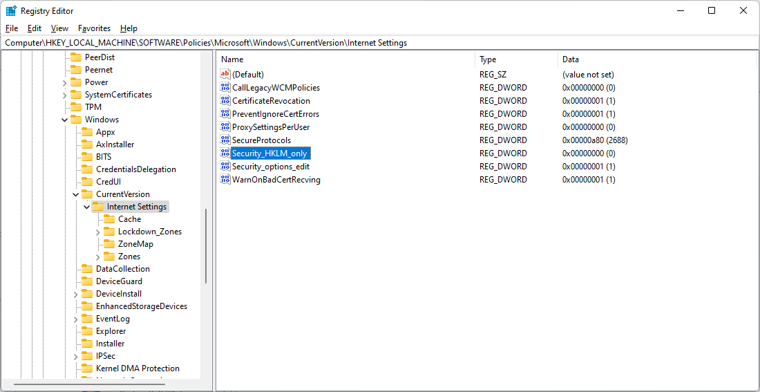 Go to Computer\ HKEY_LOCAL_MACHINE\SOFTWARE\Policies\Microsoft\Windows\CurrentVersion\Internet Settings