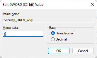Double click the Security_HKLM_only and set the value from 1 to 0.