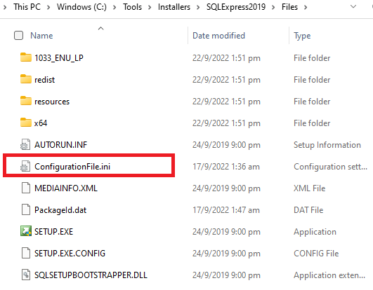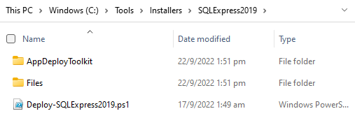 Make sure you have extracted the PowerShell App Deployment Toolkit with the Deploy-SQLExpress2019.ps1 script and SQL Server Express 2019 files that includes the ConfigurationFile.ini (for the NonInteractive installation).