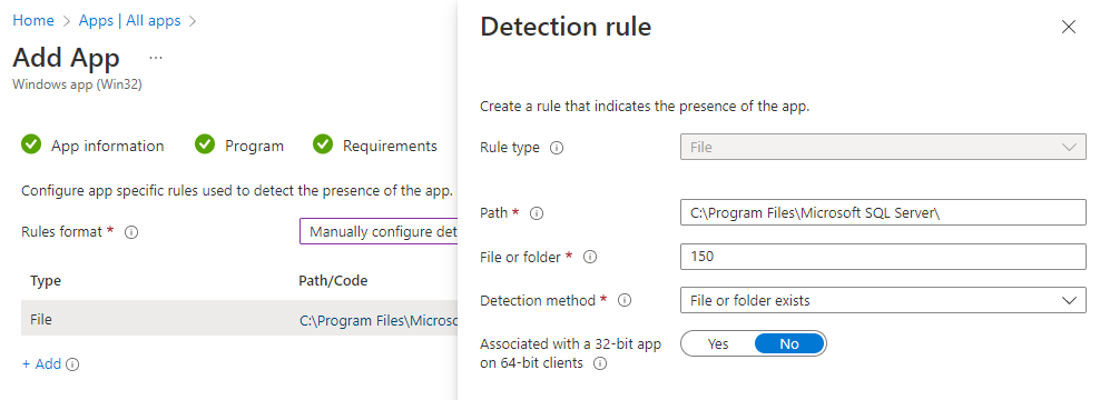 In the Detection rules choose Manually configure detection rule and selected File or folder.