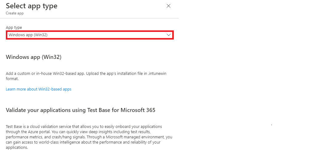 Go to Apps > All apps > +Add > Select app type the select Windows app (Win32) in the dropdown menu and click on the Select button.