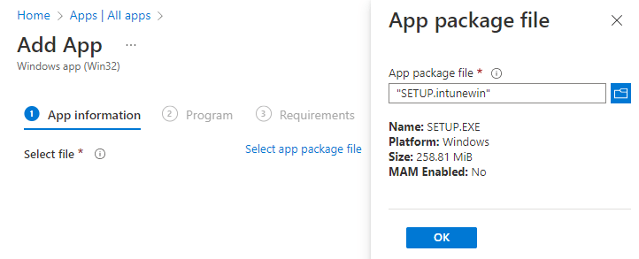 In the Add App click Select app package file and browse for the Intunewin file that you’ve created.