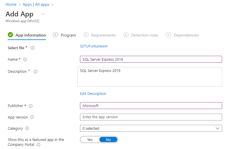 Download the IntuneWinAppUtil.exe from https://github.com/Microsoft/Microsoft-Win32-Content-Prep-Tool and create the .intunewin file for SQL Server Express 2019.