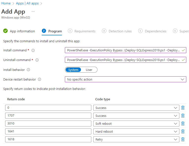 Uninstall command: PowerShell.exe -ExecutionPolicy Bypass .\Deploy-SQLExpress2019.ps1 -DeploymentType “Uninstall” -DeployMode “NonInteractive”