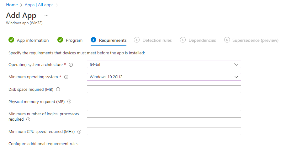 In the Requirements specify the operating system, disk, memory and processor requirements and click Next to continue